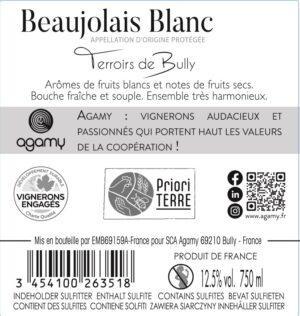 Les raisins proviennent de parcelles plantées sur la partie sud du beaujolais sur un sol argilo-calcaire. Les vendanges sont effectuées à la main. Sa robe est jaune-verte et son nez fait ressortir des arômes de fruits jaunes (pêche). Une bouche fraîche et souple avec des arômes d’agrume et une finale sur la noisette.